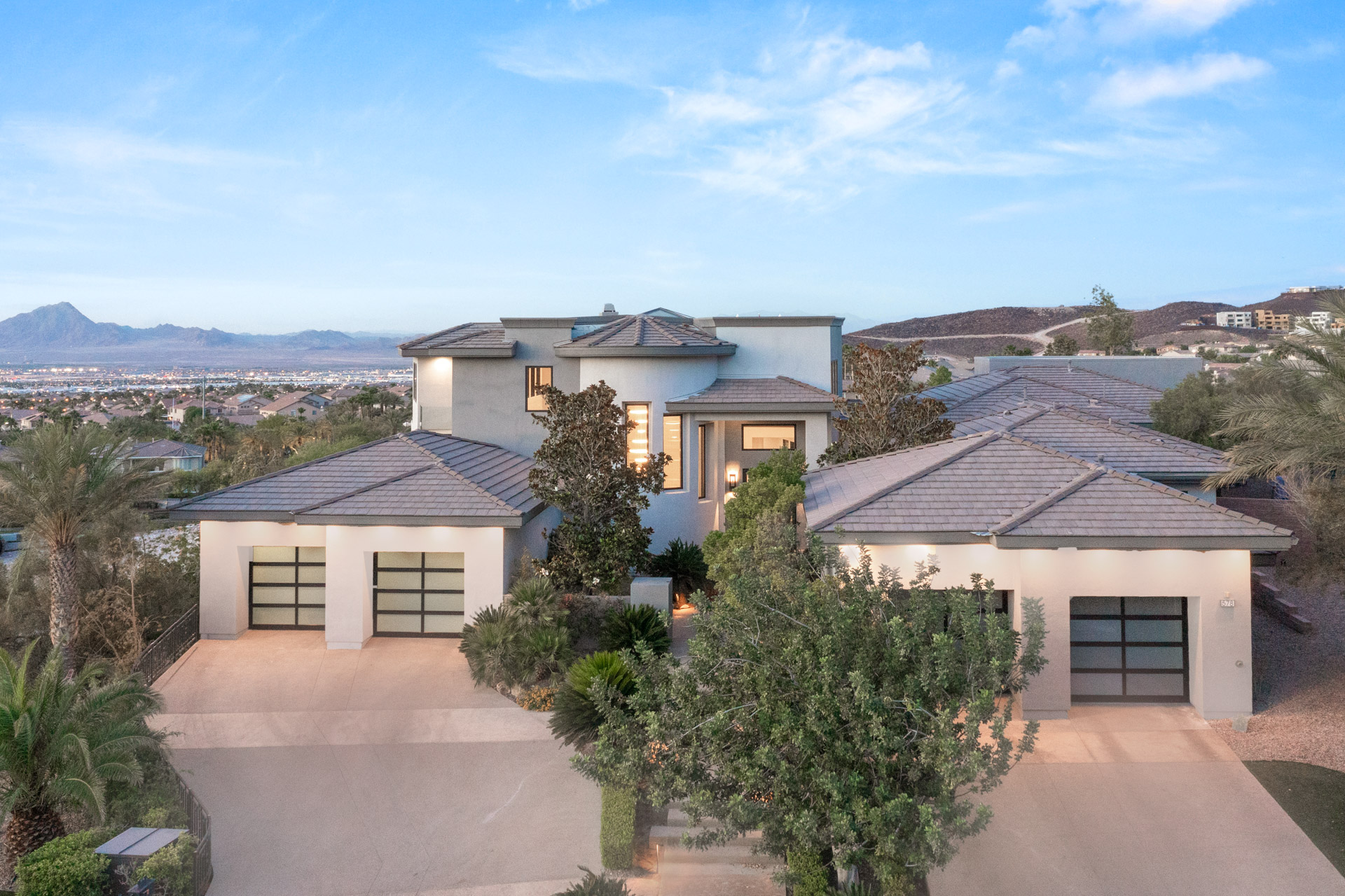 Clean, elegant, luxury defines this oasis of a home in MacDonald Highlands. The community nestled in the foothills of the McCullough Mountains is one of the top luxury communities in Greater Las Vegas. Take in sweeping 360-degree views of the Las Vegas skyline from three levels including a top floor with a master suite, office and two private decks, a main level with large family and dining areas along with four additional bedrooms, and a lower level featuring a theater, second office or spa, game room, wine room and bar and another large guest suite.
