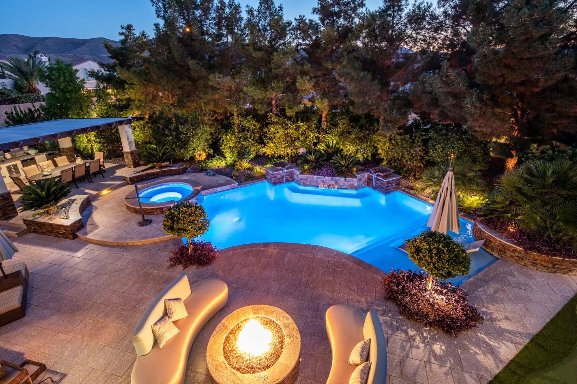This gorgeous renovated home sits on a rare .36 acre homesite behind the gates of Southern Highlands Golf Club. Perfectly manicured outdoor spaces create a private oasis. The French doors leading to the covered patio, opens to the pool and spa; surrounded by tranquil water features and fire pit. A pergola with BBQ and countertop seating overlooks the spacious side yard and pool. A spectacular setting for those who value outdoor space as much as interiors.