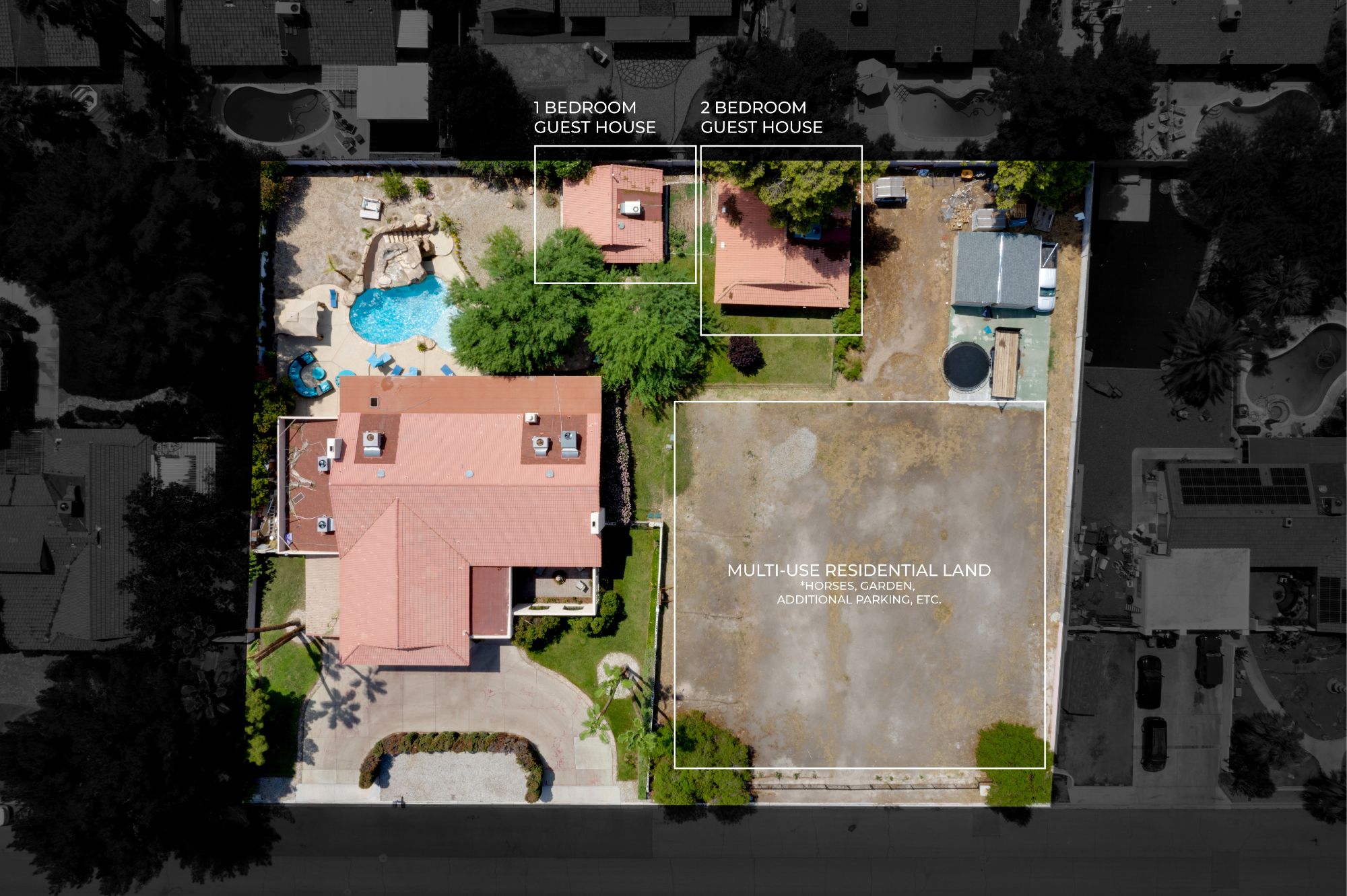 This Mediterranean-style estate occupies over an acre of land and offers a two-story main residence with a three-car garage, as well as two satellite homes. In total, there is more than 8,000 square feet of interior space, with seven bedrooms and nine bathrooms.