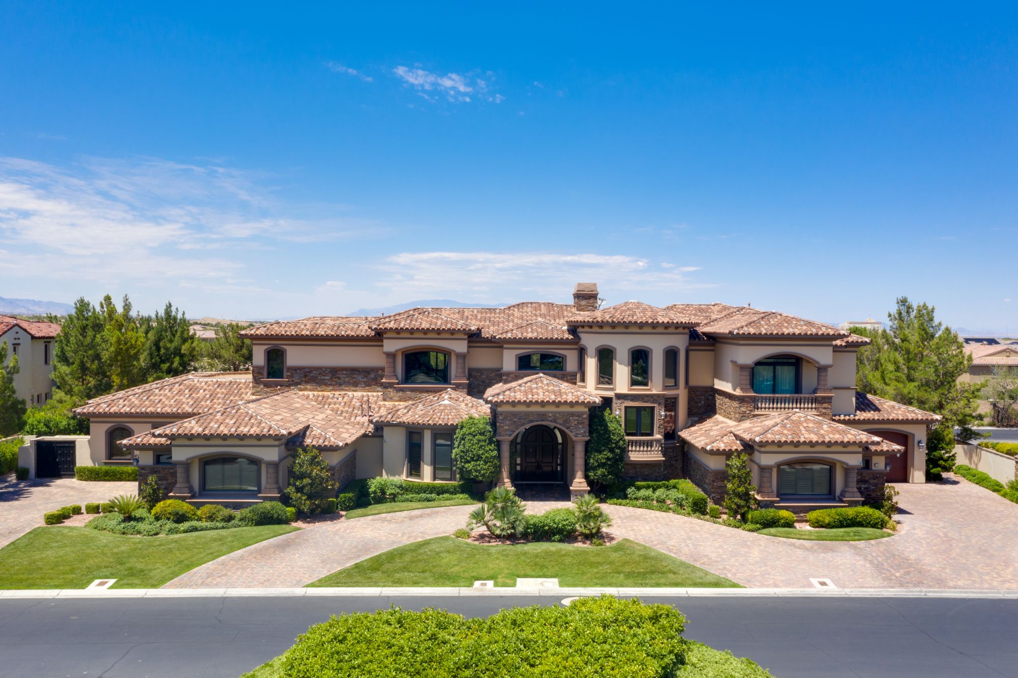A two-story Tuscan custom five-bedroom estate in the Southern Highlands Golf Club features not only an open-plan interior with dual primary bedrooms on the main level but a magnificent backyard oasis that boasts a classic pool and spa with integrated fountains and waterfalls, in addition to an outdoor basketball half-court.