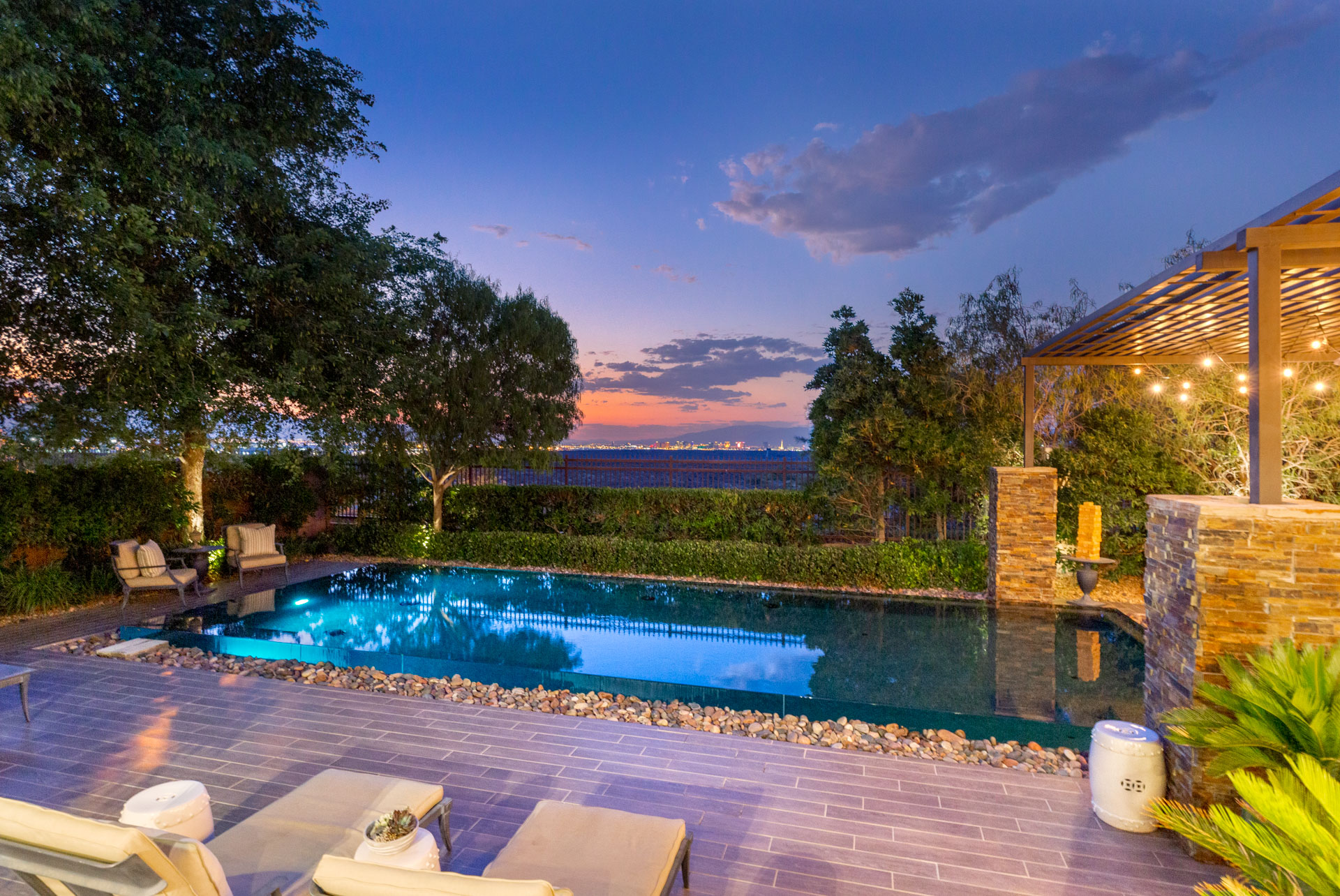 Stunning single-story Toll Bros former model home. Exceptional strip views and fabulous outdoor spaces make this home a very rare find. Designer finishes throughout featuring a gourmet kitchen with Wolf appliances and a grand island. A stylish wet bar with a seating area is perfect for entertaining. Hardwood floors, inset marble tile, unique ceiling details, beautiful lighting, and luxurious accents are found throughout.