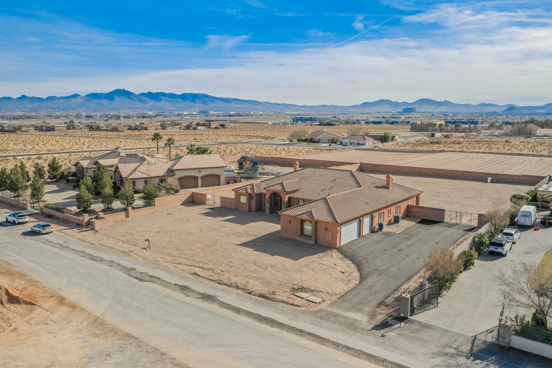 Distinctive custom home on 1.27 acres near the I-15 and not far from South Point Casino with its popular hotel and spa, awaits your personal touches. This is a unique property; located in the southwestern portion of the cosmopolitan Las Vegas area, and the zoning regulations allow horses and outbuildings, making it perfect as a multi-purpose retreat. Double gates to the property allow RV parking as well, for families that love their freedom and enjoy a variety of outdoor activities.