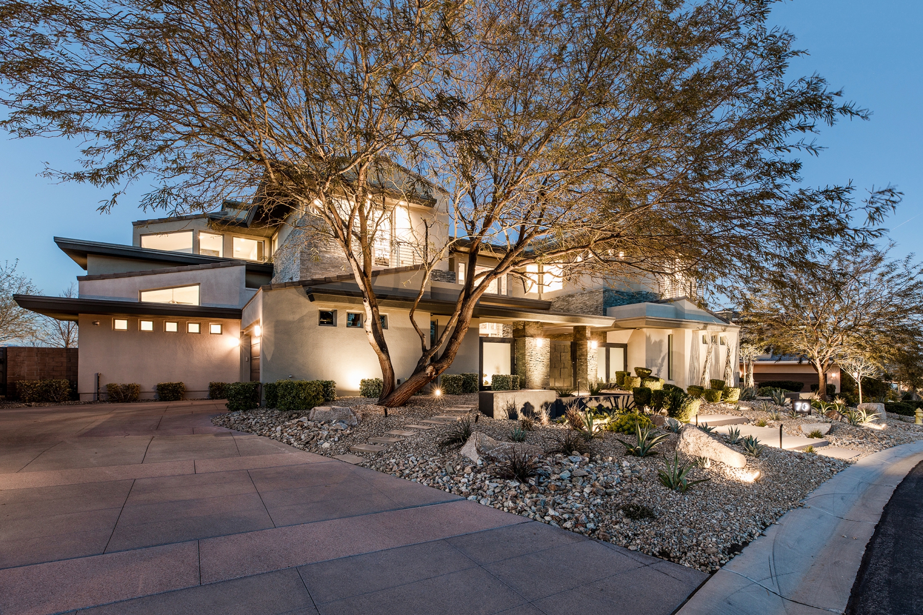 Unique desert landscaping adds to the curb appeal of this four-bedroom, five-bath home in Summerlin Village. Enter through a courtyard that only hints at the luxury features within.
