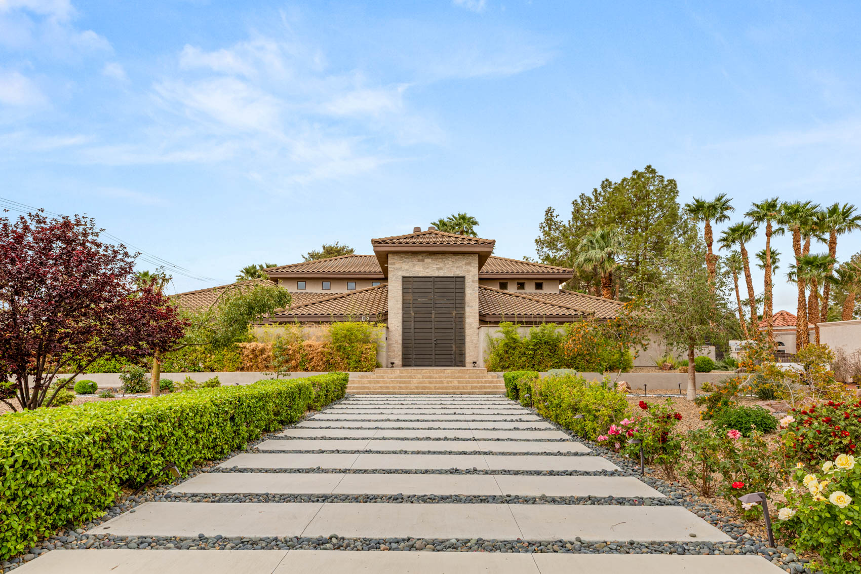 Welcome to a stunning custom estate offering nearly 5,000 sq. ft. of refined living on a 2/3-acre corner lot—just minutes from the Strip, with no HOA! This fully updated home features an open-concept design with sun-filled spaces, custom cabinetry, marble and quartz countertops, designer tile, and two elegant fireplaces.