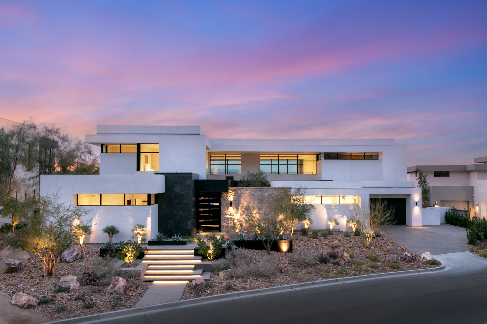 Inside, pocketing sliding glass doors dissolve the boundaries between indoor and outdoor spaces, allowing natural light and fresh air to flood the open-concept great room and kitchen. Soaring ceilings and carefully placed windows further enhance the sense of volume and connection to the stunning views beyond. The chef’s kitchen is a dream for both entertaining and everyday living, featuring top-of-the-line Dacor appliances, sleek cabinetry, and a private butler pantry for discreet prep and storage. The adjacent dining and living areas flow effortlessly to the expansive outdoor entertaining space, where a sparkling pool, spa, outdoor shower, and dedicated pool bathroom await. A full outdoor kitchen and covered patio complete this alfresco haven, ideal for hosting guests or enjoying peaceful evenings under the stars. The upper level is anchored by the luxurious primary suite, a true retreat with a private balcony that offers panoramic views and its own fireplace for cozy nights. The spa-inspired primary bath includes a freestanding soaking tub, dual vanities, and a walk-in shower, all finished with rich textures and calming tones. A spacious, custom-built walk-in closet provides ample storage with thoughtfully designed built-ins. Three additional en-suite bedrooms offer comfort and privacy for family and guests, each echoing the home’s cohesive modern style and natural palette. Additional flexible spaces can be tailored to a home office, gym, or media lounge depending on your lifestyle needs. The 4-car garage is equally well-appointed, featuring an EV charger, epoxy flooring, and generous cabinetry for additional storage. Every inch of this residence has been designed with both form and function in mind, resulting in a home that feels as luxurious as it is livable. Located within ASCAYA—Henderson’s most prestigious hillside enclave known for its architectural integrity and curated luxury—residents enjoy a private clubhouse, fitness center, tennis and pickleball courts, resort-style pool, and a vibrant sense of community. With 24/7 security and quick access to world-class dining, entertainment, and top-rated schools, ASCAYA offers an unmatched lifestyle just minutes from the Strip yet worlds away. 9 Boulderback Drive is more than a home—it’s a rare opportunity to own a true architectural statement in one of the most sought-after neighborhoods in the Las Vegas Valley. Whether you're entertaining on a grand scale or simply soaking in the views from your private balcony, this exceptional estate captures the essence of desert-modern living at its finest.