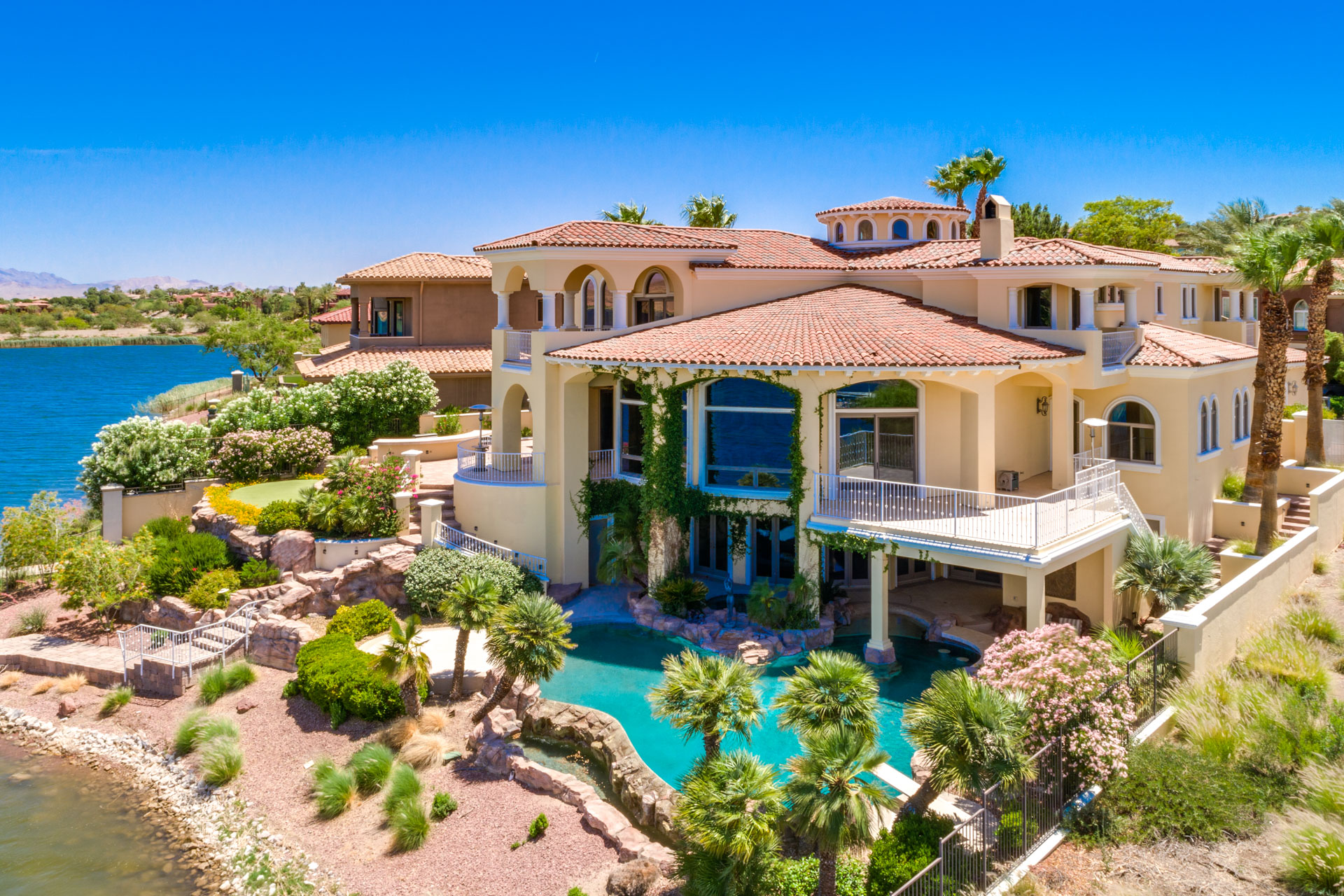 Waterfront, lakeside living - these are the most requested and coveted properties in Lake Las Vegas. This European-inspired home will not disappoint. With a golf course, mountain, and panoramic water views, this masterpiece was built with upscale entertaining in mind.