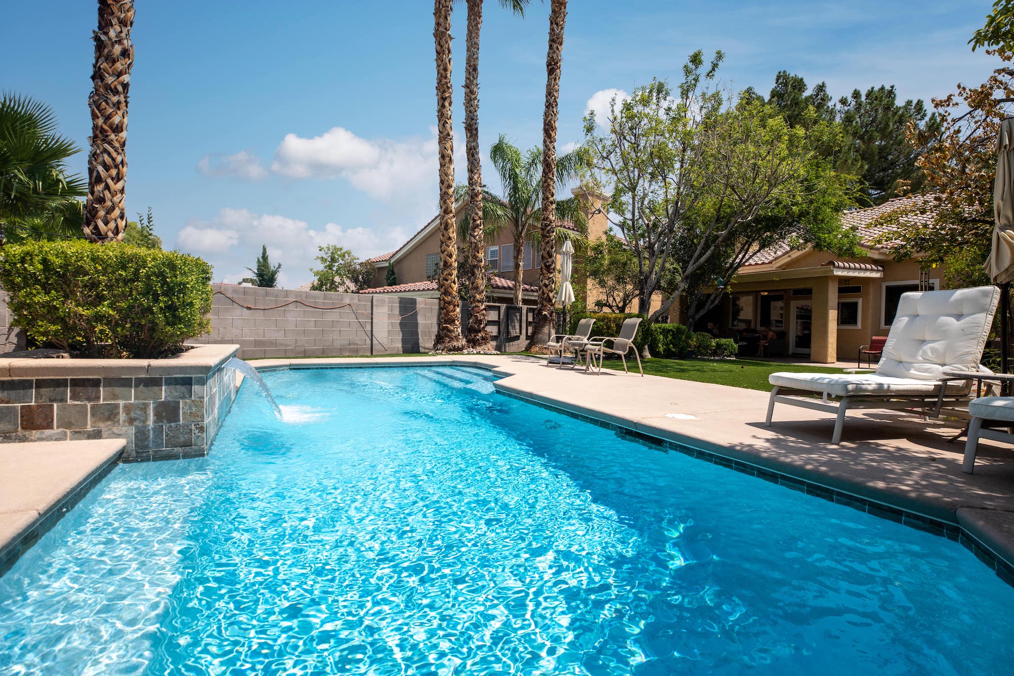 Desirable location in Summerlin! Home features 3 bedrooms with 3 bathrooms, an open floor plan with vaulted ceiling, travertine flooring, and 2 beautiful fireplaces.