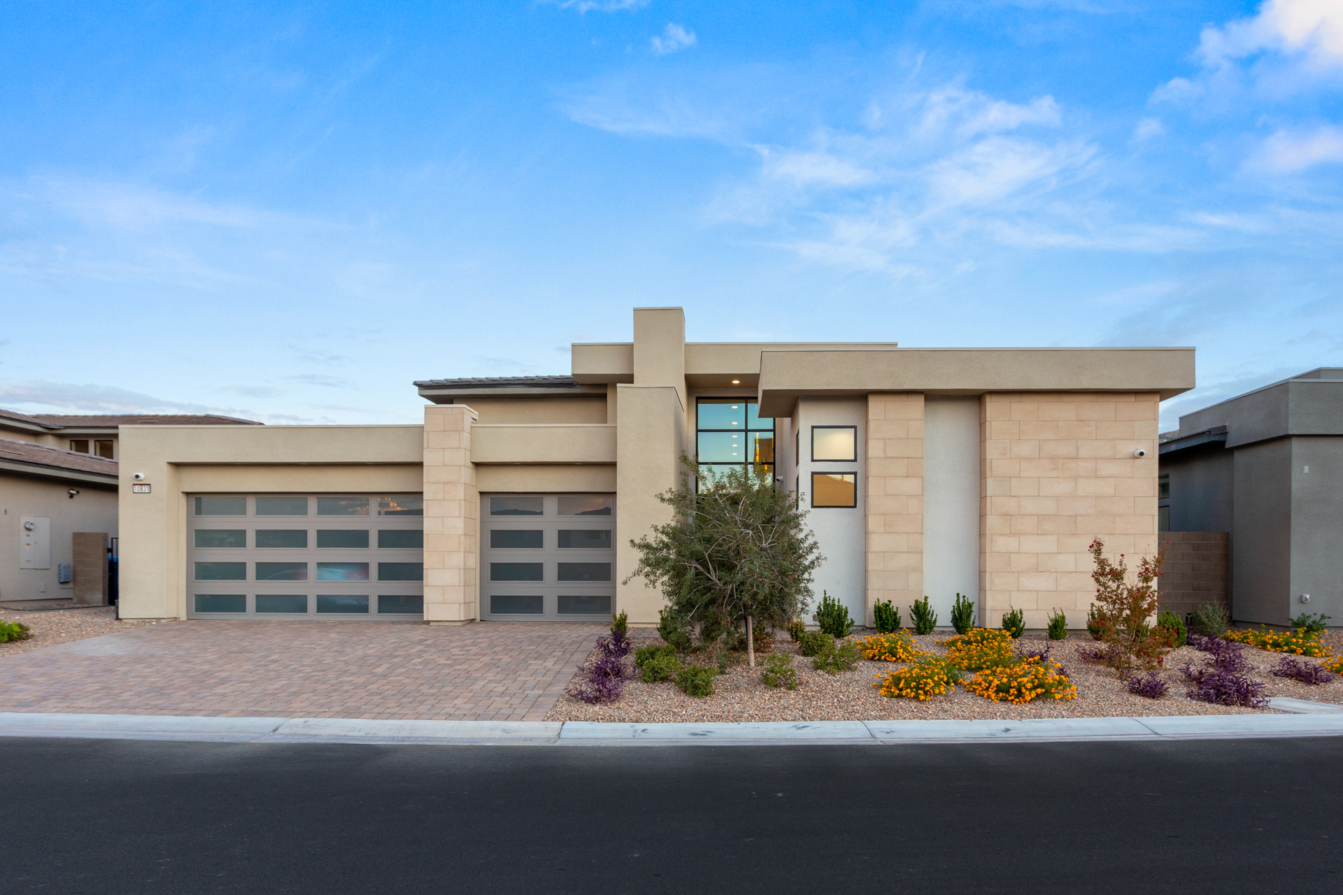 A modern home with sweeping vista views, this contemporary villa enjoys all the indoor and outdoor comforts. With 4 bedrooms, 3 and a half baths, 3,451 sq. ft. located in Mesa Ridge, a guard-gated community nestled in Summerlin, this house welcomes you to true enjoyment of desert living. Glass pocket doors expand a great room to the covered patio and pool deck beyond creating the perfect indoor and outdoor experience.