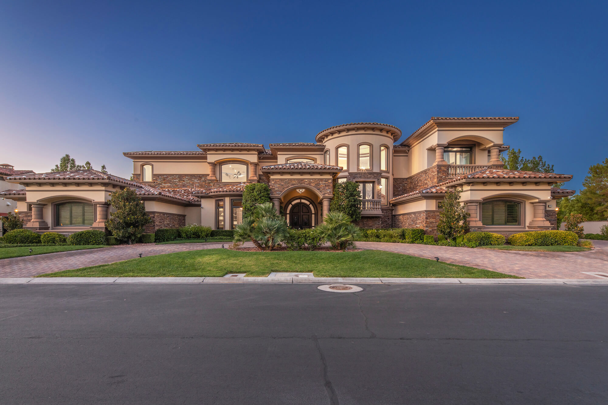A chic two-story custom five-bedroom estate in the Southern Highlands Golf Club features not only an open-plan interior with dual primary bedrooms on the main level but a backyard oasis that boasts a classic pool and spa with fountains and waterfalls, in addition to an outdoor basketball half-court.