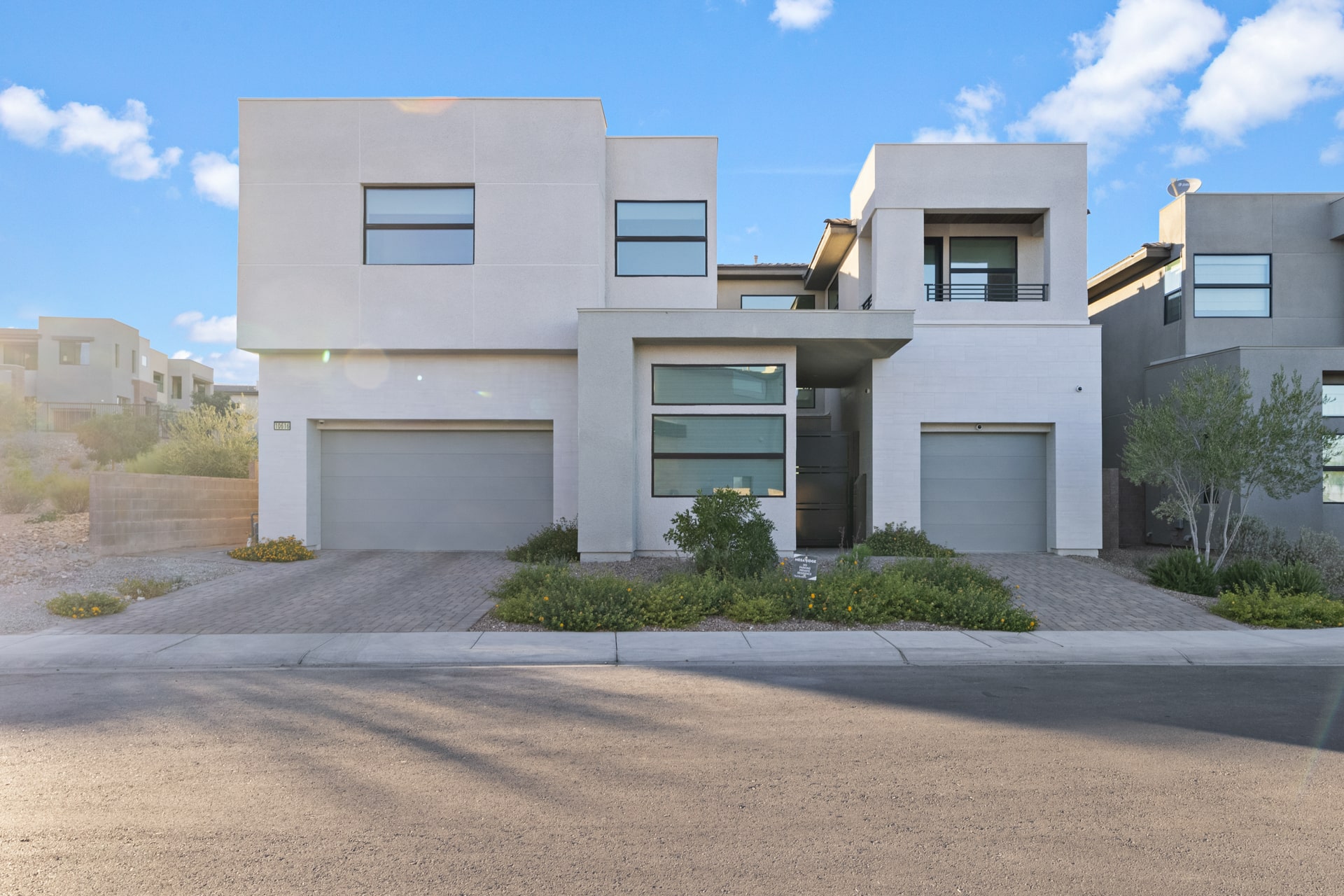 The spacious elegance of this home is evident from the moment you enter the private courtyard. Walking into the foyer feels a bit breathtaking, with its vaulted ceilings and sweeping open concept on the main level. Featuring luxurious finishes, lighting, wood, and metal touches that make this home so very special. From the dining area, you make your way through the panoramic glass doors to the fabulous covered patio, pool, and spa. There is also a fire pit and plenty of space for seating and entertainment with guests.
