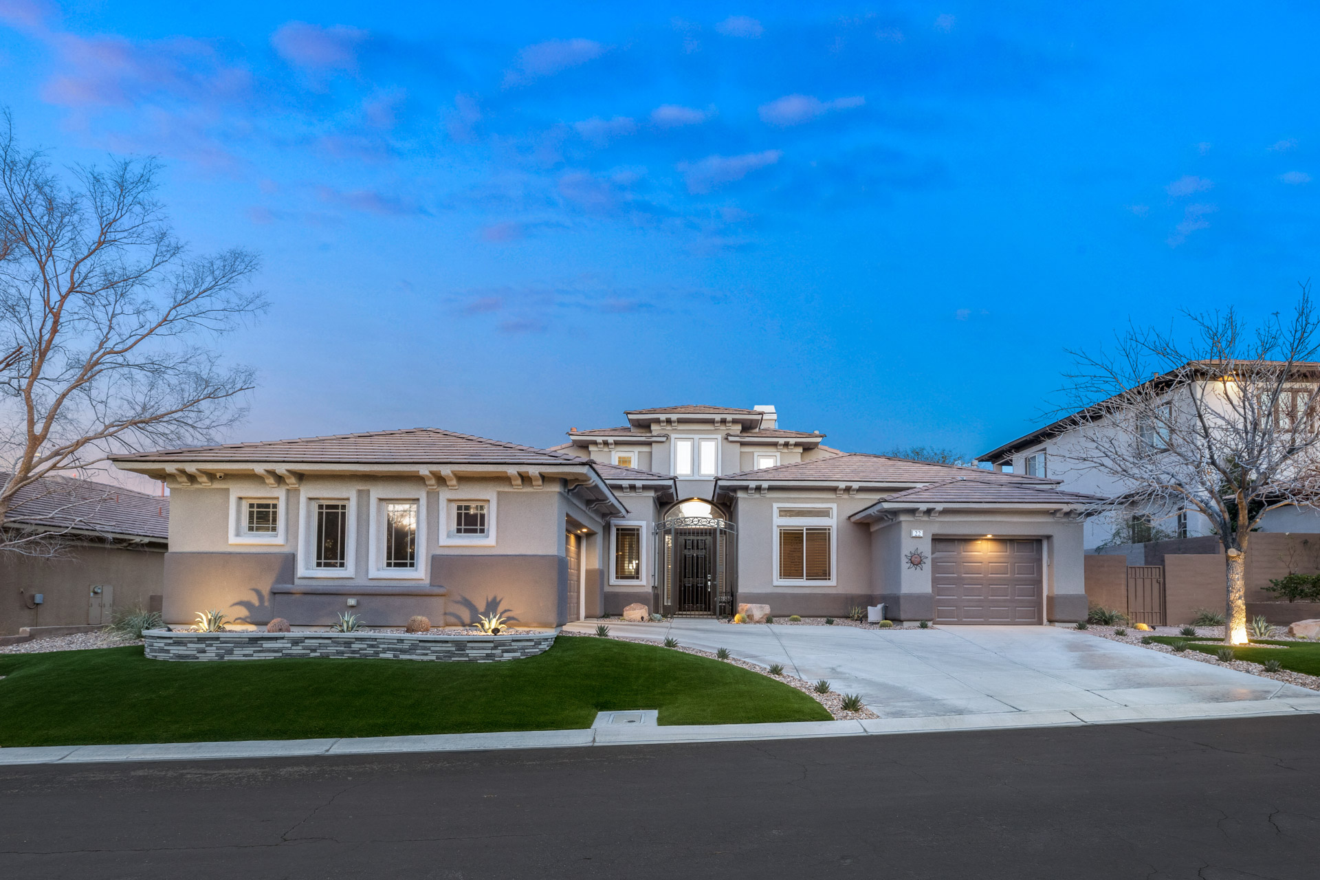 his newly remodeled single-story home is perfect for those who love to entertain. Enter through a custom-gated courtyard to the bright, spacious Overture model with soaring high ceilings. The living room has an elegant, cozy fireplace and a full custom cocktail bar which opens to a large, covered patio, creating the perfect indoor/outdoor living experience.