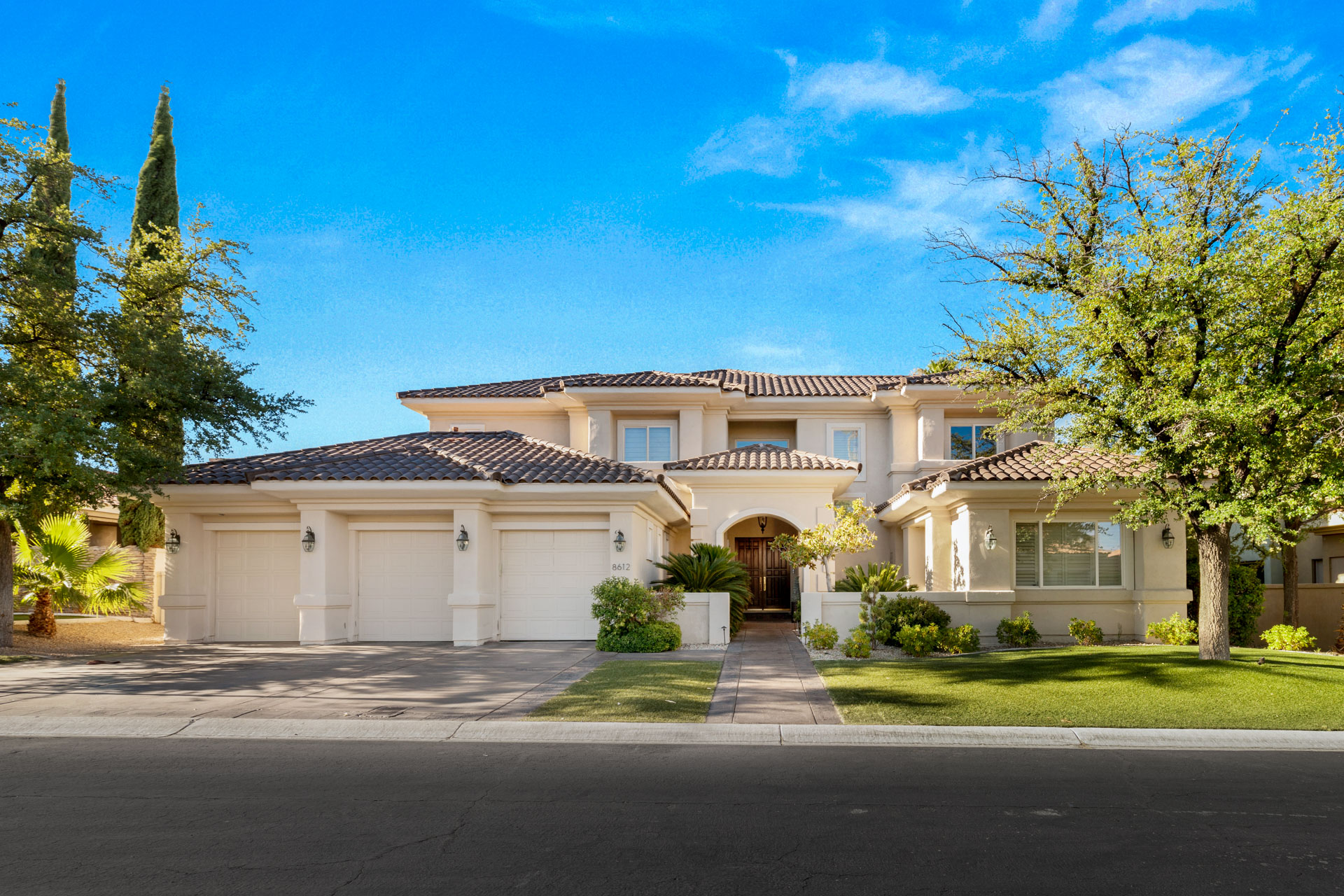 Covered patio and pool deck with pool, hot tub, and views of the greens beyond. The spacious first-level master suite includes a bay window, soaking tub, and separate walk-in shower, along with a walk-in closet with custom built-ins. A second-floor bonus room with custom built-in bookcase leads to a private balcony.