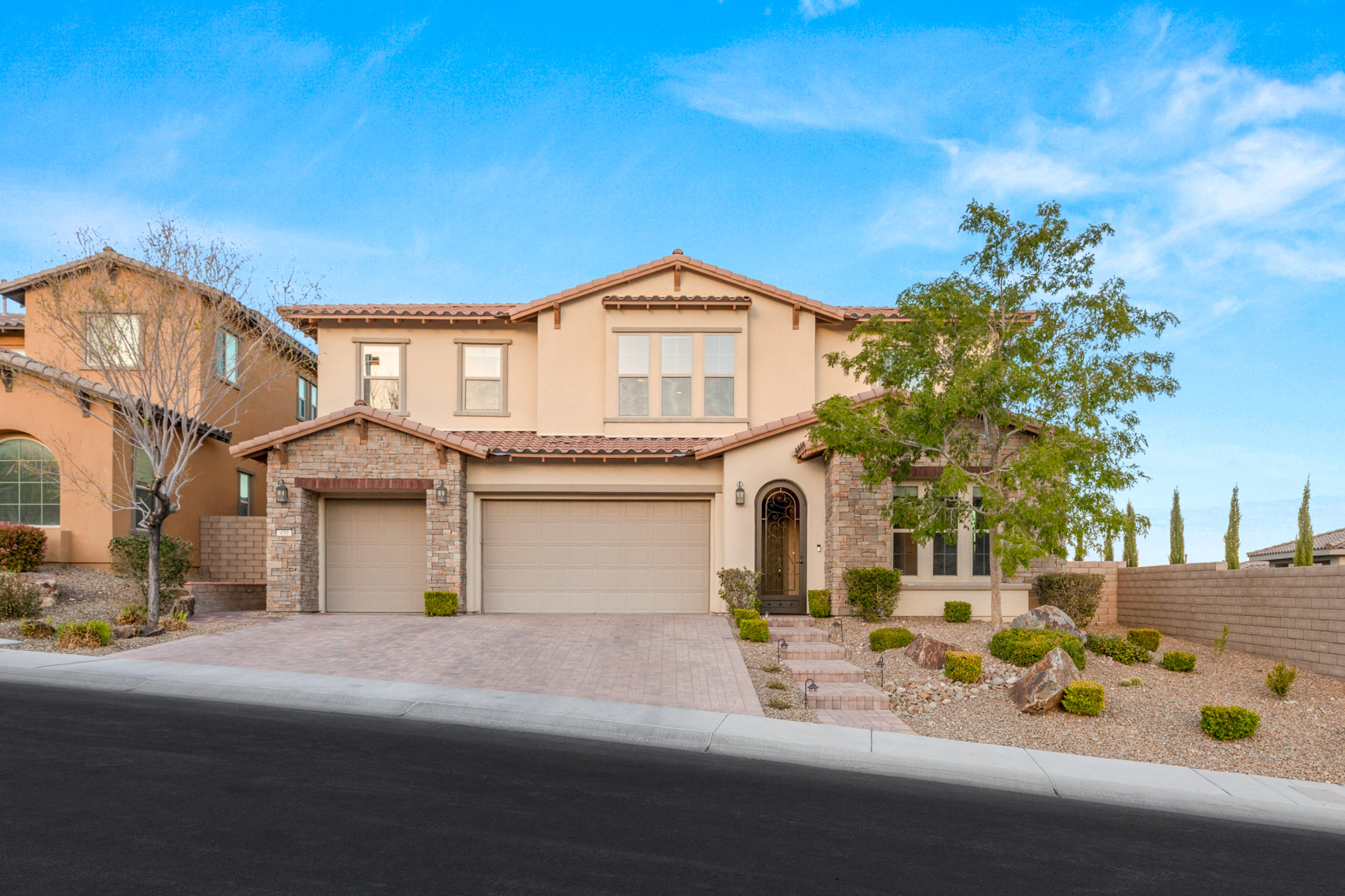 The main level welcomes you with an inviting warmth, enhanced by the rich texture of shiplap accents in the living room. Built-in entertainment centers flank the walls, offering both functionality and style. Large sliding glass doors seamlessly connect the interior to the covered back patio, blurring the lines between indoor and outdoor living. A culinary haven awaits in the Chef’s kitchen, where form meets function in perfect harmony. Adorned with sleek quartz countertops and equipped with top-of-the-line stainless steel appliances, including double ovens, this space is designed to elevate the art of cooking to new heights. Adjacent to the kitchen, the breakfast nook beckons with its own set of sliding doors leading to the patio, inviting the gentle morning sun to filter in as you savor your first cup of coffee. Ascend the grand staircase to the upper level, where luxury unfolds at every turn. Here, the oversized loft offers endless possibilities, whether as a serene office space bathed in natural light or a captivating entertainment area for hosting guests. The primary suite stands as a sanctuary unto itself, with a separate retreat area that can be tailored to your desires—a private office, a cozy reading nook, or simply a tranquil space to unwind and recharge. The ensuite bathroom is a symphony of indulgence, boasting separate sinks, a large freestanding soaking tub, and a luxurious walk-in shower. A spacious walk-in closet with custom built-ins ensures that every wardrobe essential has its own dedicated space. From the primary suite, step out onto the expansive balcony and behold the awe-inspiring vistas that stretch before you. With 180-degree views of the city skyline and the iconic Las Vegas Strip, this is a vantage point unlike any other—a true sanctuary for the soul. With a total of 5 bedrooms and 5 bathrooms, including a guest suite on the main level, this home effortlessly accommodates both family and visitors with grace and style. Outside, a veritable oasis awaits, beckoning you to bask in the beauty of your own private retreat. A sparkling pool offers respite from the desert heat, while a soothing spa promises moments of pure relaxation under the desert sky. A water feature adds a touch of serenity to the landscape, while a covered outdoor kitchen with a fireplace invites al fresco dining and entertaining year-round. Adjacent to the pool, a separate fire feature provides the perfect setting for cozy evenings spent under the stars, surrounded by the gentle flicker of flames and the laughter of loved ones. With its gated entryway and extra privacy, this home offers a rare opportunity to own a slice of paradise in one of the most sought-after communities in Summerlin. Don't miss your chance to experience luxury redefined at 450 Beautiful Hill.
